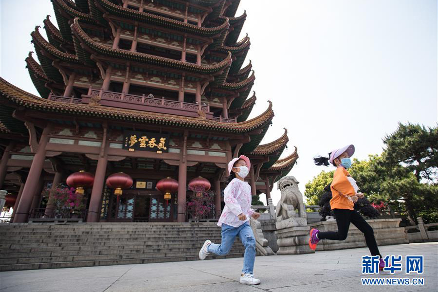 1/0武漢黃鶴樓,兒童在重新開(kāi)放的黃鶴樓景區(qū)奔跑(4月29日攝)。(新華社記者 肖藝九/攝)