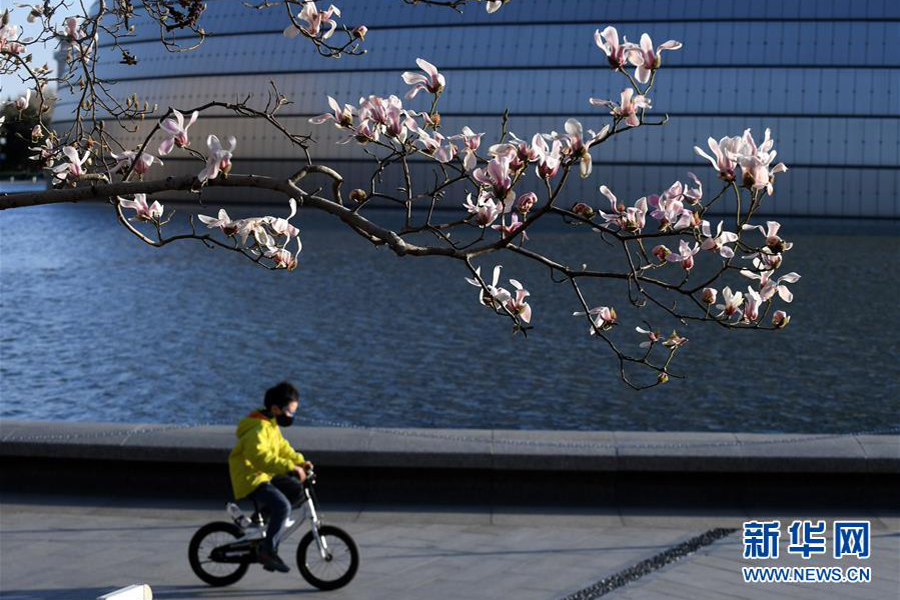 1/0北京國(guó)家大劇院,小男孩在吐露芬芳的玉蘭花下騎車(3月14日攝)。(新華社記者 羅曉光/攝)
