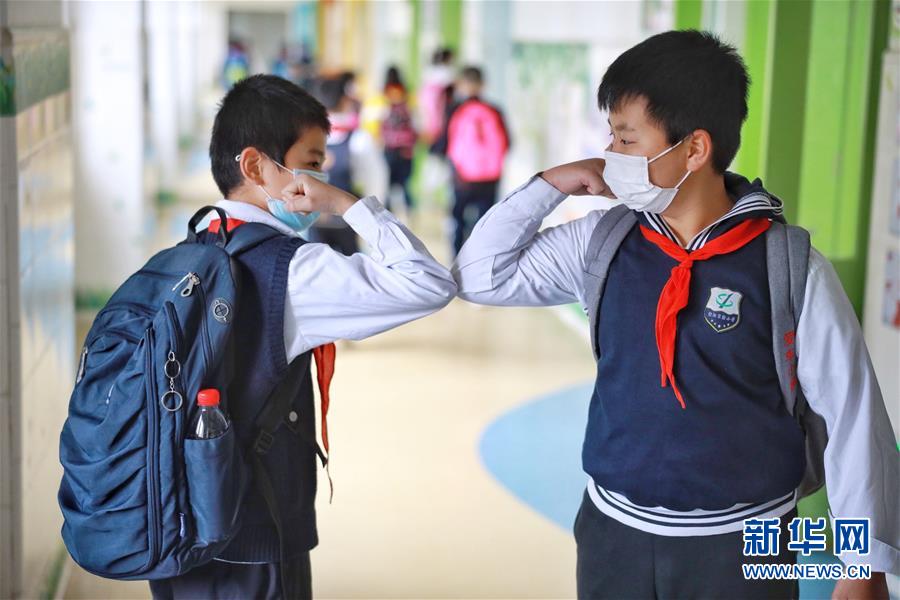 1/0貴州貴陽(yáng),小學(xué)復(fù)課,兩名學(xué)生用“碰肘”的方式打招呼(5月25日攝)。 (新華社記者 劉續(xù)/攝)