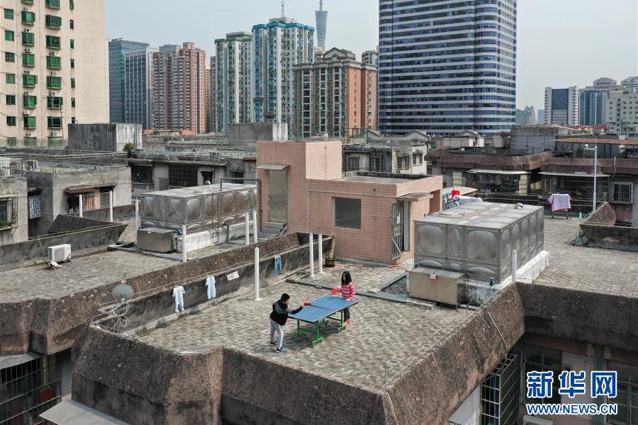 1/0廣東廣州,兩名小朋友在樓頂上打乒乓球(4月10日攝)。(新華社記者 劉大偉/攝)