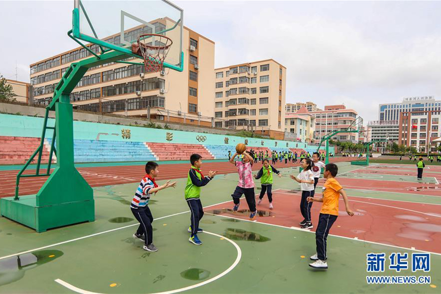 1/06月2日,在山東省榮成市第二實驗小學(xué),小學(xué)生們在球場上打籃球。(新華社發(fā) 李信君/攝)