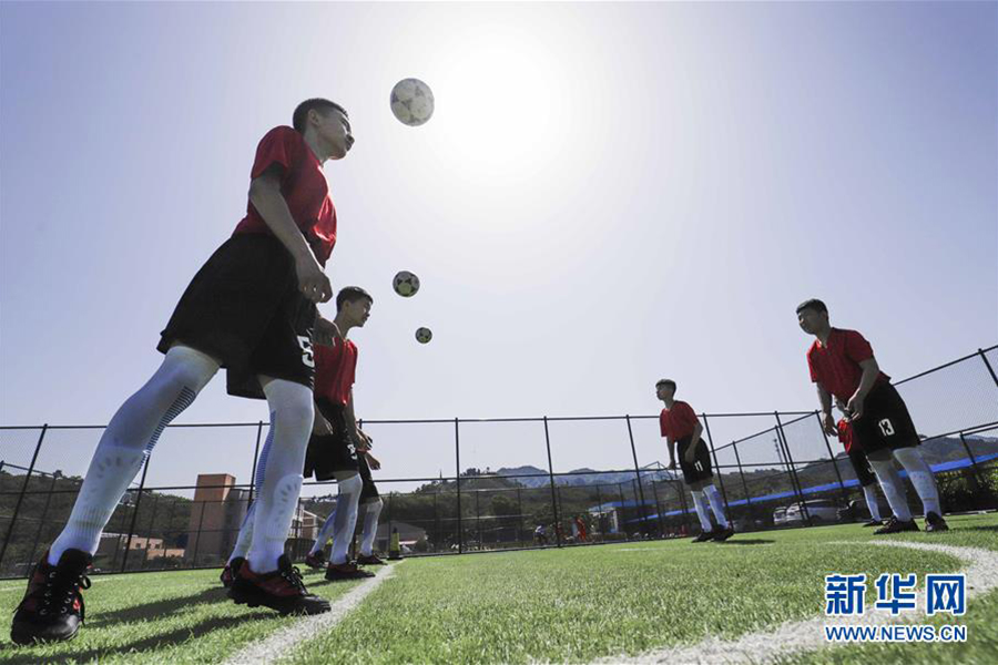 1/06月2日,河北唐山遵化市小廠鄉(xiāng)洪山口九年一貫制學(xué)校學(xué)生在足球場進行頭頂球練習(xí)。(新華社發(fā) 劉滿倉/攝)