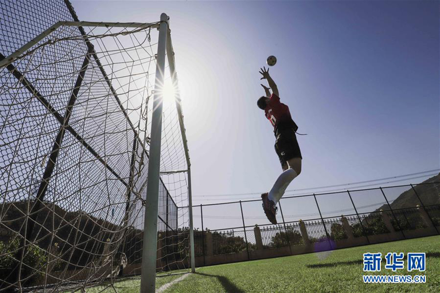 1/06月2日,河北唐山遵化市小廠鄉(xiāng)洪山口九年一貫制學(xué)校學(xué)生在足球場進行守門練習(xí)。(新華社發(fā) 劉滿倉/攝)