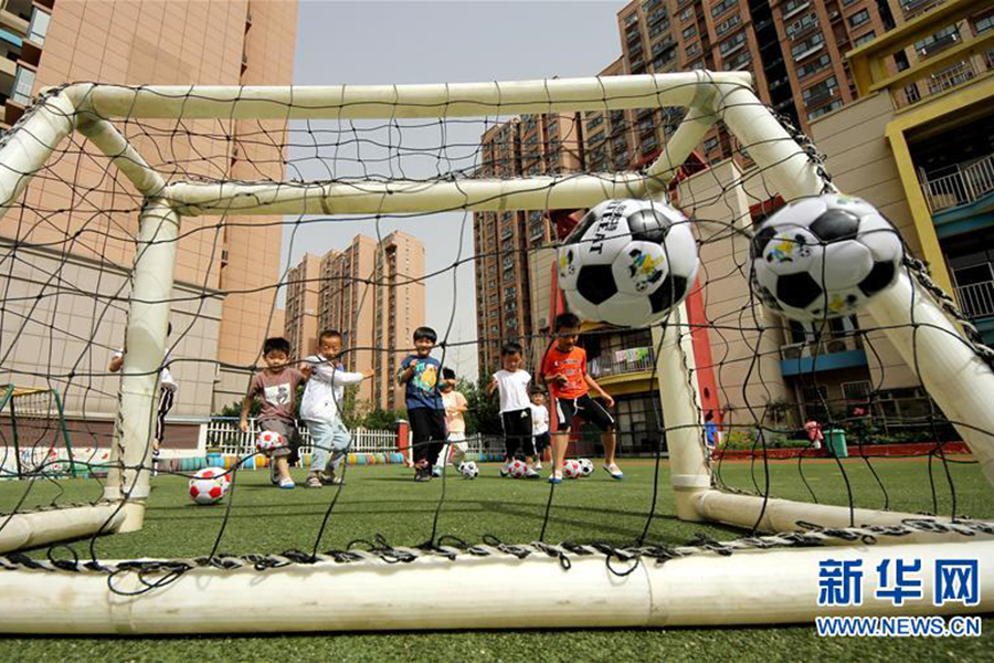 1/06月2日,山東省棗莊市鑫昌路小學(xué)幼兒園的小朋友在園內(nèi)踢足球。(新華社發(fā) 孫中喆/攝)