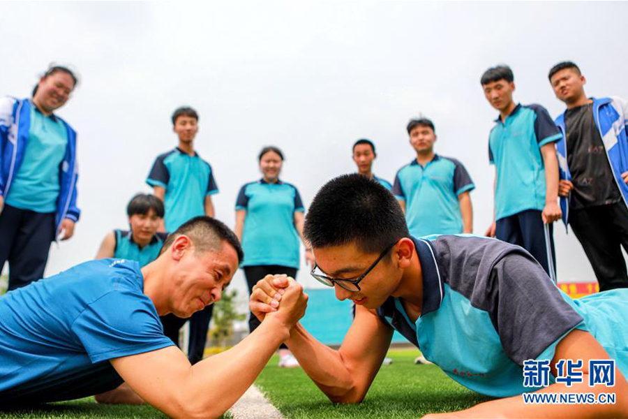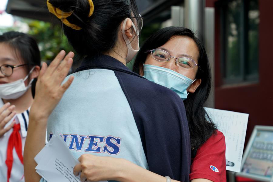 1/06月27日,在上海市閔行區(qū)莘松中學(xué)考點(diǎn),送考的老師擁抱即將進(jìn)入考場的學(xué)生,送上祝福。(新華社記者 劉穎/攝)