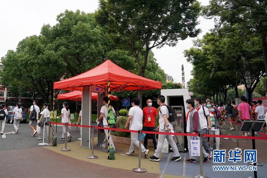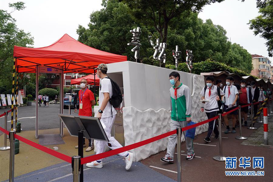 1/06月27日,在上海市閔行區(qū)莘松中學(xué)考點(diǎn),考生依次通過測溫門進(jìn)入校園。(新華社記者 劉穎/攝)