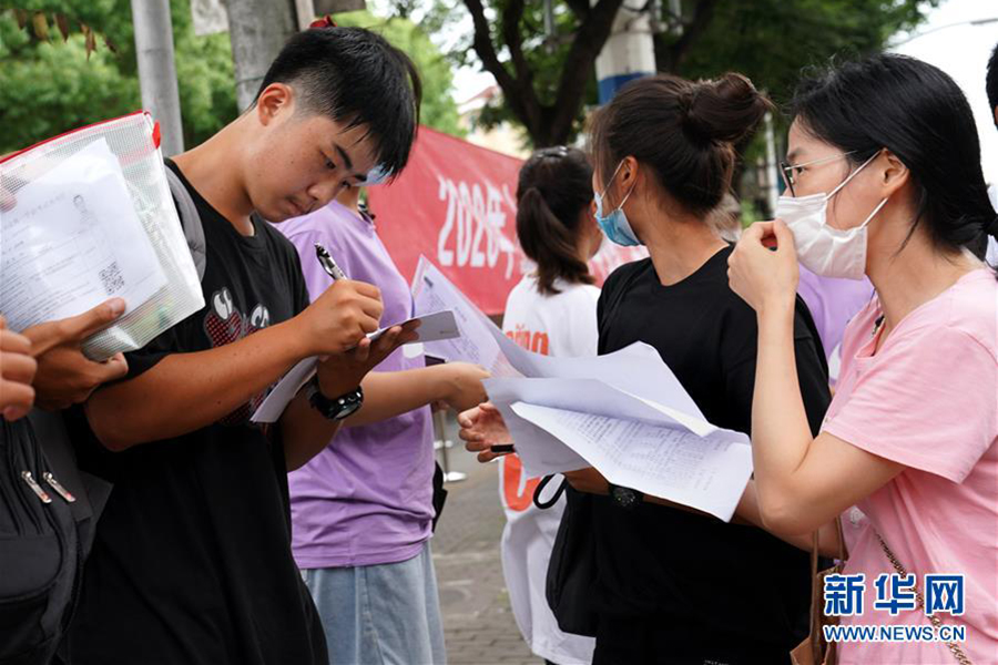 1/06月27日,在上海市閔行區(qū)莘松中學(xué)考點(diǎn)前,上海市第二體育運(yùn)動學(xué)校的學(xué)生在《考生考試安全承諾書》上簽名,然后統(tǒng)一交考點(diǎn)保存。(新華社記者 劉穎/攝)