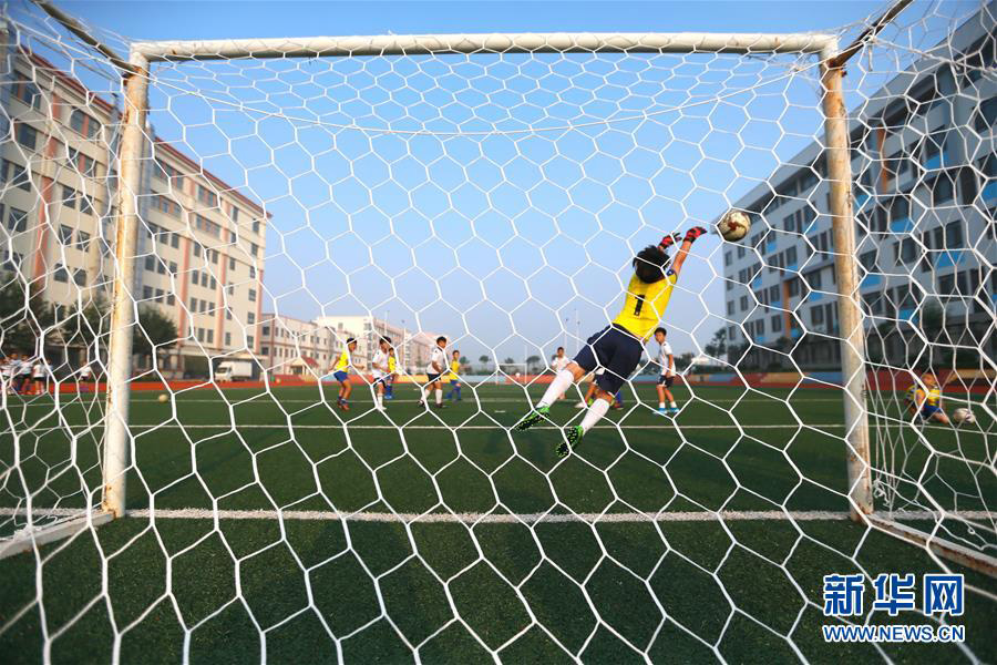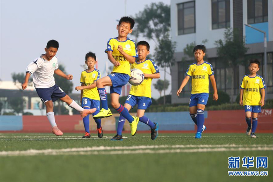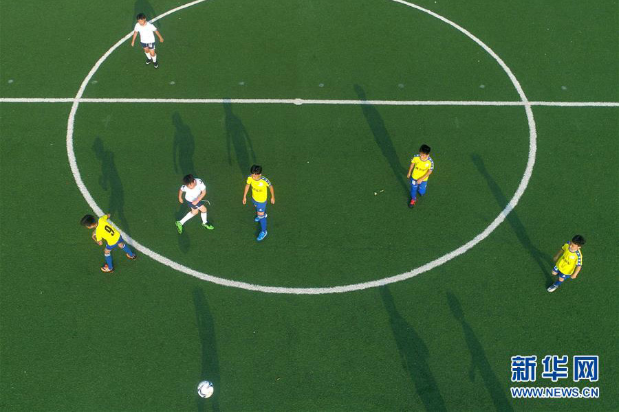 1/07月16日,青島通濟實驗學(xué)校的小球員在足球場上進(jìn)行比賽。(新華社發(fā) 梁孝鵬/攝)