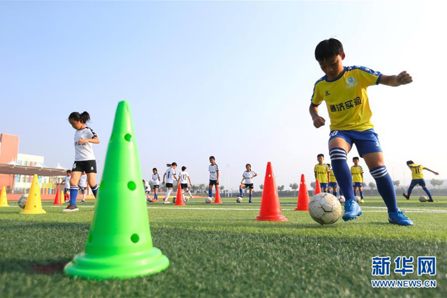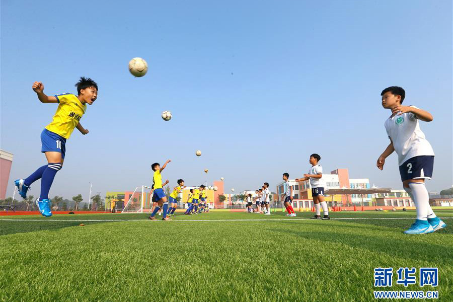 1/07月16日,青島通濟實驗學(xué)校的小球員在進(jìn)行頭球訓(xùn)練。(新華社發(fā) 梁孝鵬/攝)