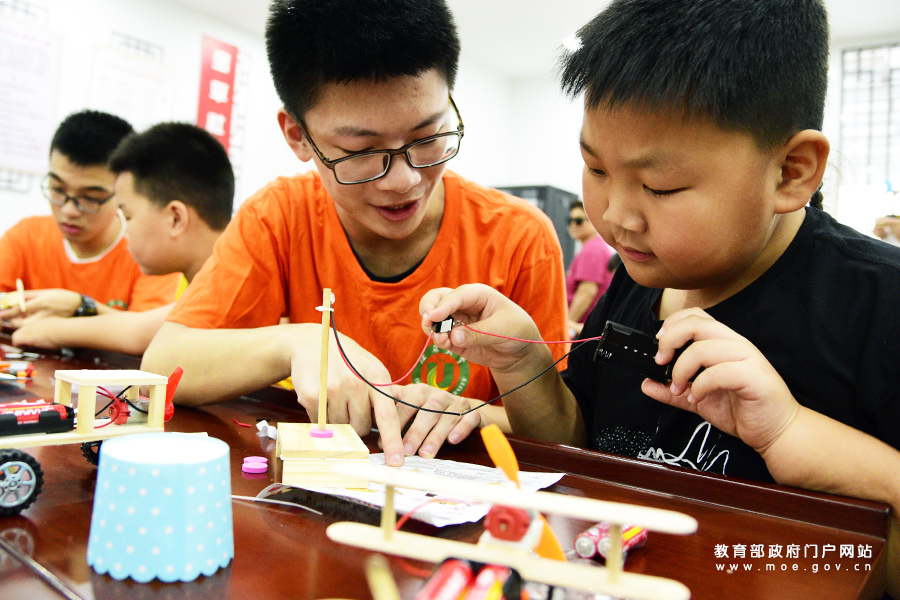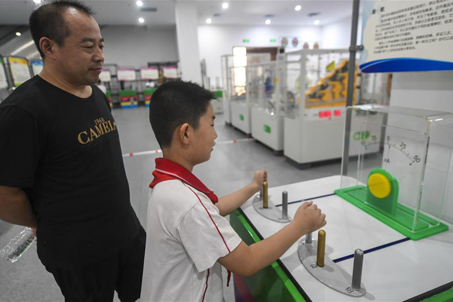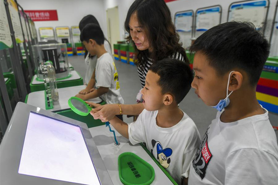 1/08月4日,小朋友在中國流動科技館河北巡展永清站體驗“手蓄電池”儀器。(新華社記者 李曉果/攝)