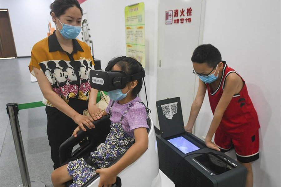 1/08月4日,小朋友在中國流動科技館河北巡展永清站體驗“虛擬現(xiàn)實動感座椅”。 (新華社記者 李曉果/攝)