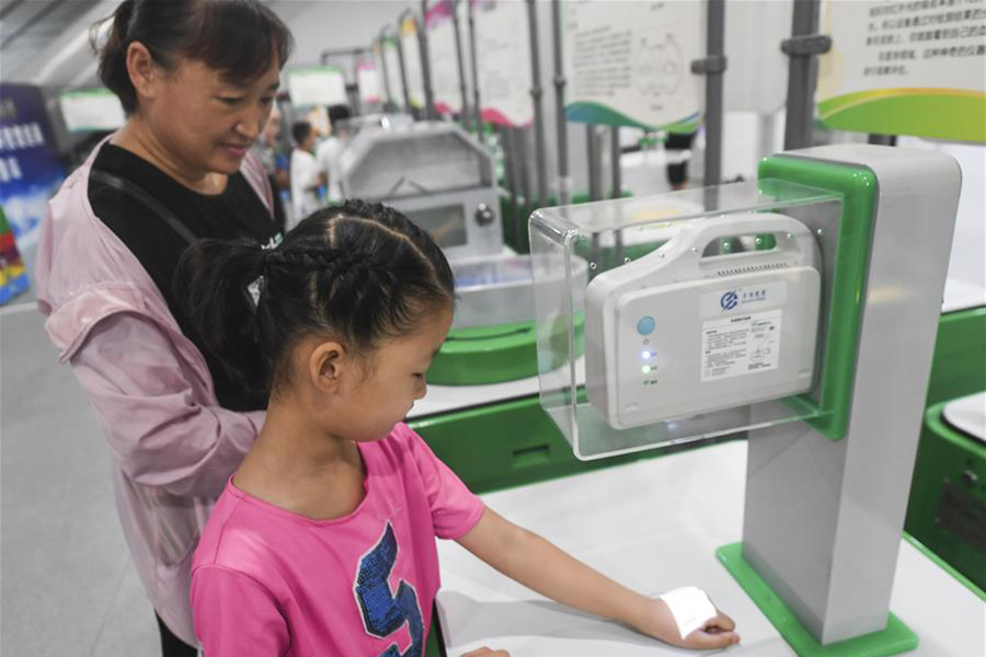 1/08月4日,小朋友在中國流動科技館河北巡展永清站體驗“紅外血管成像”。 (新華社記者 李曉果/攝)