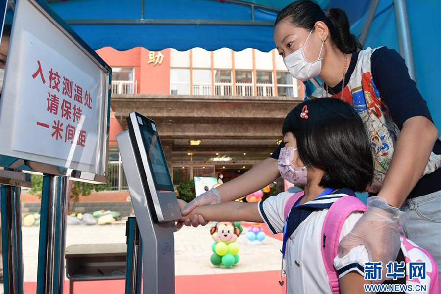 1/08月29日,在北京市海淀區(qū)東升實(shí)驗(yàn)小學(xué),一年級學(xué)生在老師指導(dǎo)下接受測溫。(新華社記者 李賀/攝)