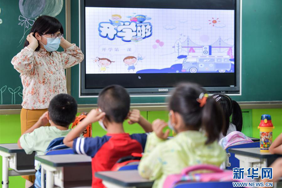 1/08月29日,北京市海淀區(qū)東升實(shí)驗(yàn)小學(xué)一年級老師向?qū)W生展示口罩的正確佩戴方式。(新華社記者 李賀/攝)