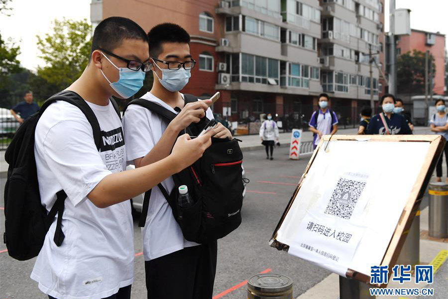 1/08月29日,北京理工大學(xué)附屬中學(xué)學(xué)生掃碼進(jìn)入校園。(新華社記者 張晨霖/攝)