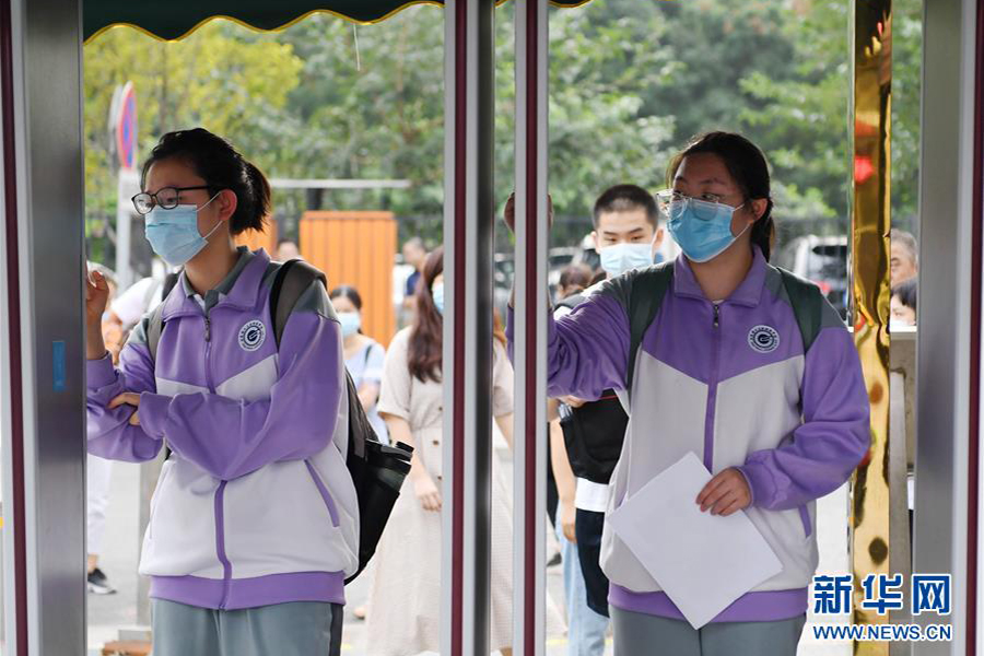 1/08月29日,北京理工大學(xué)附屬中學(xué)學(xué)生在進(jìn)入校園前接受測溫。(新華社記者 張晨霖/攝)