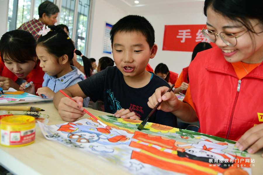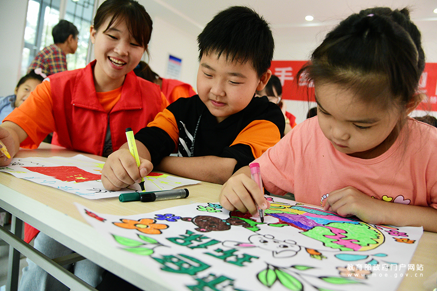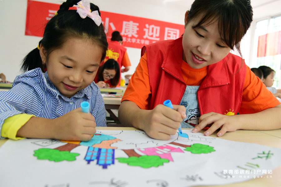 1/09月26日,在江蘇省鎮(zhèn)江市寶平社區(qū),江蘇大學(xué)志愿者在指導(dǎo)小朋友描畫小康生活主題繪畫作品。(石玉成/攝)
