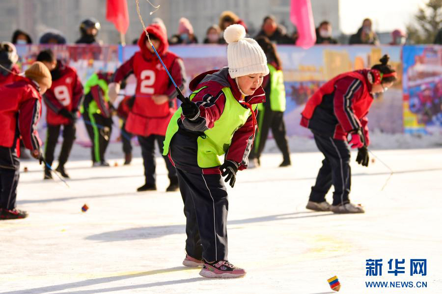 1/012月21日,烏蘭察布市集寧區(qū)建國四路小學學生在校園冰雪文化節(jié)上參加冰上抽陀螺運動。(新華社發(fā) 王正/攝)