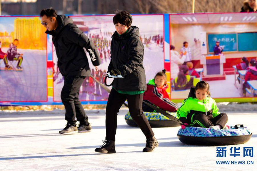 1/012月21日,烏蘭察布市集寧區(qū)建國四路小學學生和家長在校園冰雪文化節(jié)上參加冰上親子運動。(新華社發(fā) 王正/攝)
