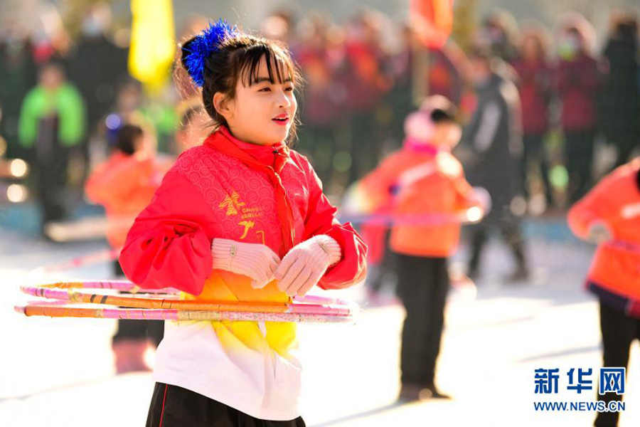1/012月21日,烏蘭察布市集寧區(qū)建國四路小學學生在校園冰雪文化節(jié)上表演冰上呼啦圈。(新華社發(fā) 王正/攝)