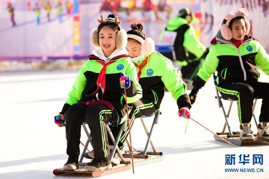 1/012月21日,烏蘭察布市集寧區(qū)建國四路小學學生在校園冰雪文化節(jié)上參加滑冰車運動。(新華社發(fā) 王正/攝)