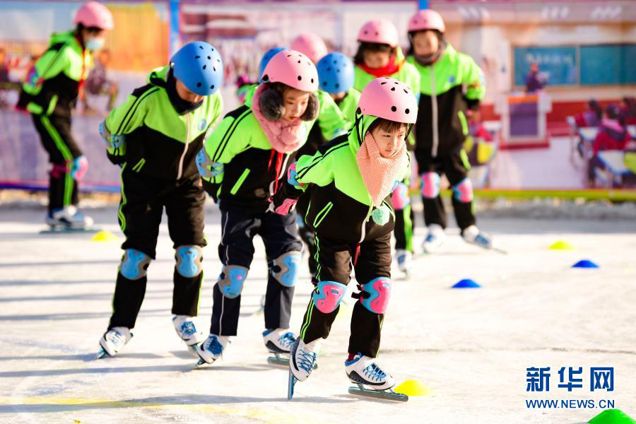 1/012月21日,烏蘭察布市集寧區(qū)建國四路小學短道速滑隊在校園冰雪文化節(jié)上表演。(新華社發(fā) 王正/攝)