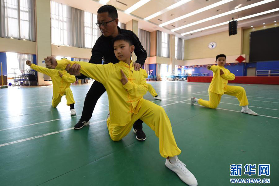 1/01月13日,合肥市一六八玫瑰園學(xué)校武術(shù)社團(tuán)的學(xué)生在教練指導(dǎo)下練習(xí)武術(shù)。(新華社記者 周牧/攝)