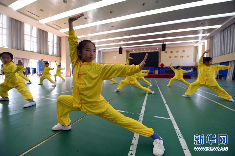 1/01月13日,合肥市一六八玫瑰園學(xué)校武術(shù)社團(tuán)的學(xué)生在練習(xí)武術(shù)。(新華社記者 周牧/攝)