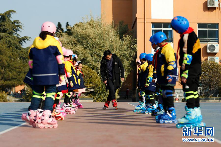 1/01月19日,在江蘇泗洪育才實(shí)驗(yàn)學(xué)校,輪滑教練在指導(dǎo)輪滑隊(duì)員。(新華社發(fā) 許昌亮/攝)