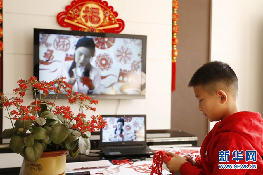 1/02月7日,河北省邢臺(tái)市第三中學(xué)附屬小學(xué)的學(xué)生通過(guò)網(wǎng)絡(luò)跟隨老師學(xué)習(xí)剪紙。(新華社發(fā) 張馳/攝)