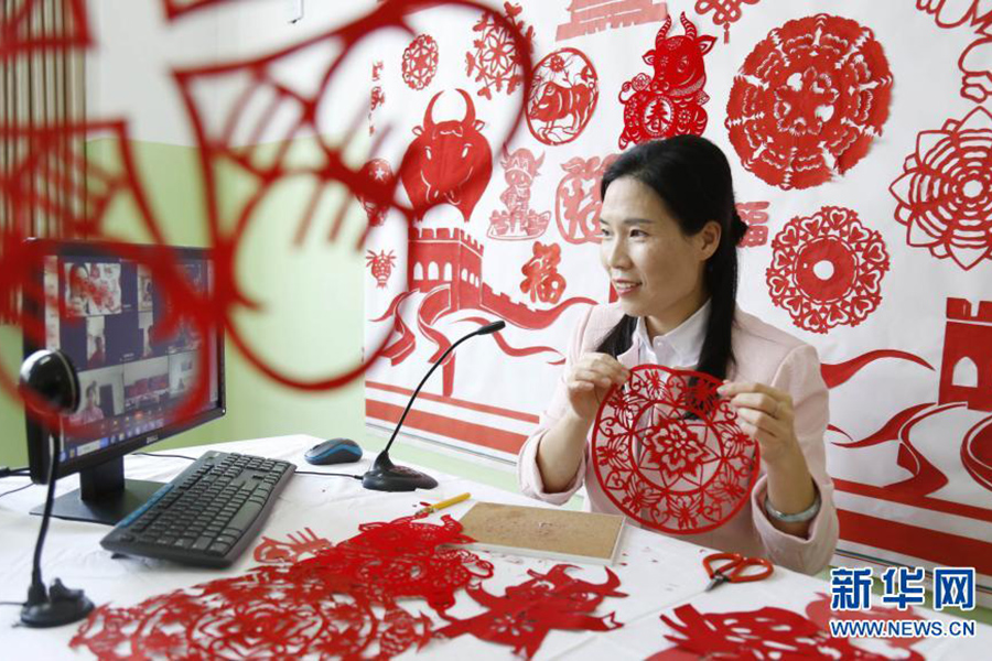 1/02月7日,河北省邢臺(tái)市第三中學(xué)附屬小學(xué)的老師通過(guò)網(wǎng)絡(luò)教授學(xué)生剪紙。(新華社發(fā) 張馳/攝)