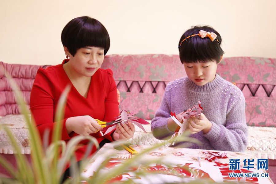 1/02月7日,河北省邢臺(tái)市第三中學(xué)附屬小學(xué)的學(xué)生和家長(zhǎng)通過(guò)網(wǎng)絡(luò)跟隨老師學(xué)習(xí)剪紙。(新華社發(fā) 張馳/攝)