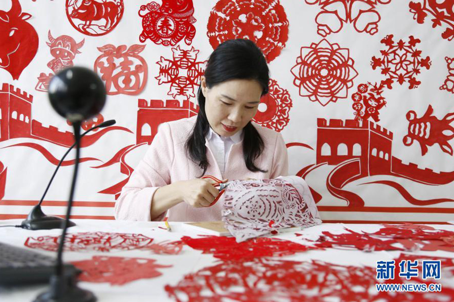 1/02月7日,河北省邢臺(tái)市第三中學(xué)附屬小學(xué)的老師通過(guò)網(wǎng)絡(luò)向?qū)W生展示剪紙作品。(新華社發(fā) 張馳/攝)