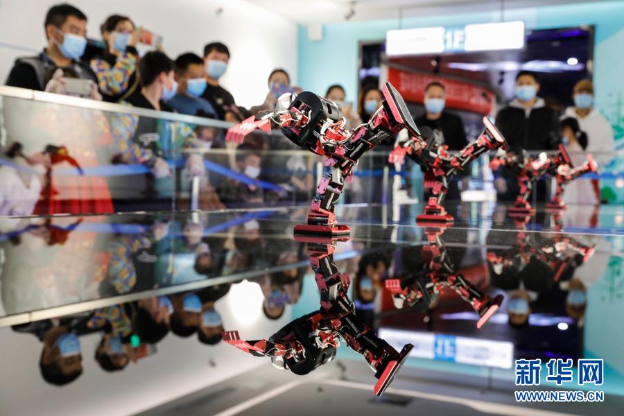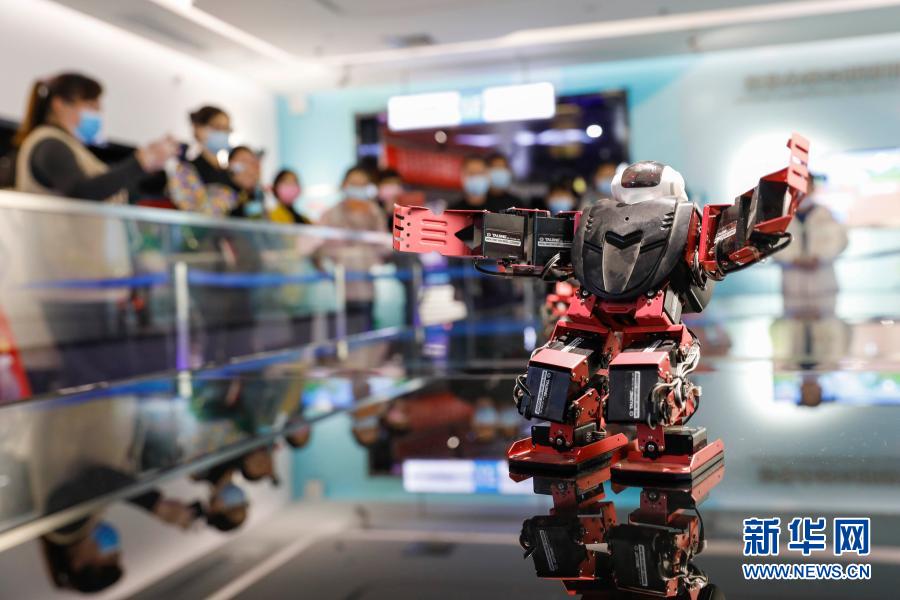 1/02月14日,觀眾在河南省寶豐縣科技館觀看機器人跳舞。(新華社發(fā) 何五昌/攝)