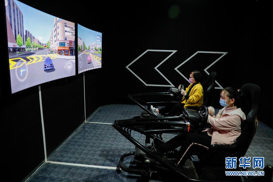 1/02月14日,觀眾在河南省寶豐縣科技館體驗“賽道英雄”游戲。(新華社發(fā) 何五昌/攝)
