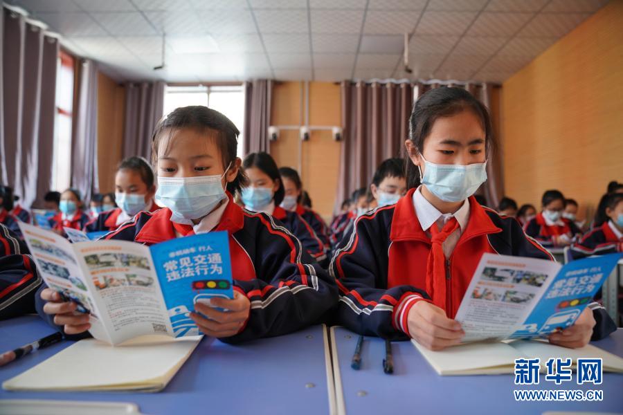 1/03月3日,河北省沙河市第四中學(xué)學(xué)生在閱讀交通安全知識手冊。(新華社記者 牟宇/攝)