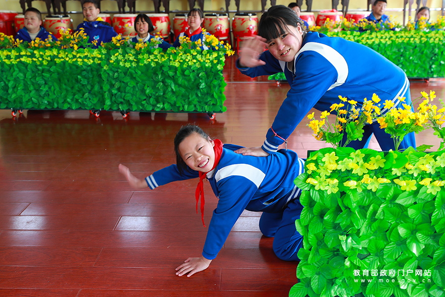 3月23日,貴州省務(wù)川縣特教學(xué)校學(xué)生在排練《牧牛童趣》,準(zhǔn)備參加貴州省特校文藝會(huì)演。(鄭啟彥、張學(xué)軍/攝)