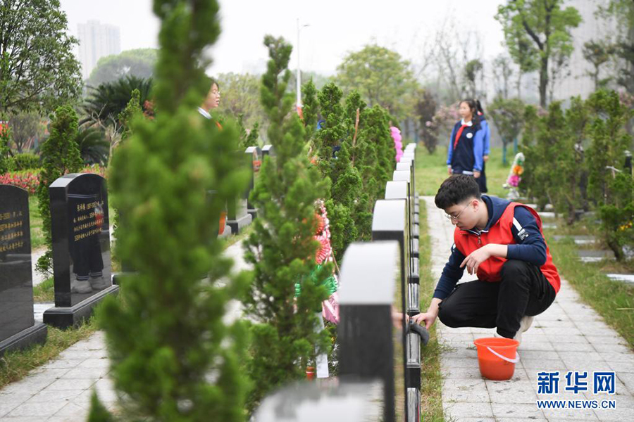 1/03月30日,志愿者在湖南革命陵園擦拭墓碑。(新華社記者 薛宇舸/攝)