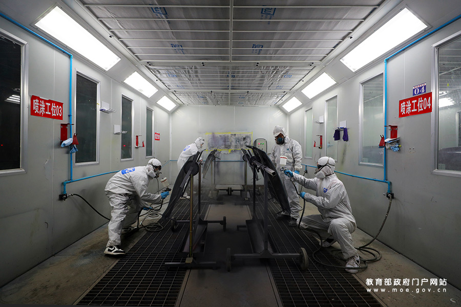 3月25日,貴州省遵義市播州區(qū)中等職業(yè)學校汽車產(chǎn)教融合實訓基地,汽車維修專業(yè)學生在進行噴漆實訓。(鄭啟彥 張學軍/攝)