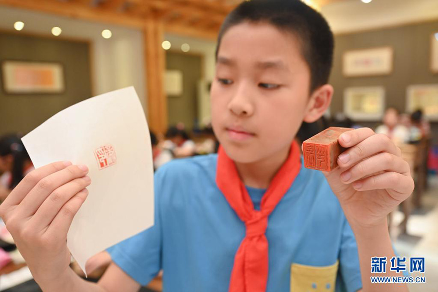 1/05月11日,在福州市烏山小學,篆刻興趣班學生在展示篆刻作品。(新華社記者 宋為偉/攝)