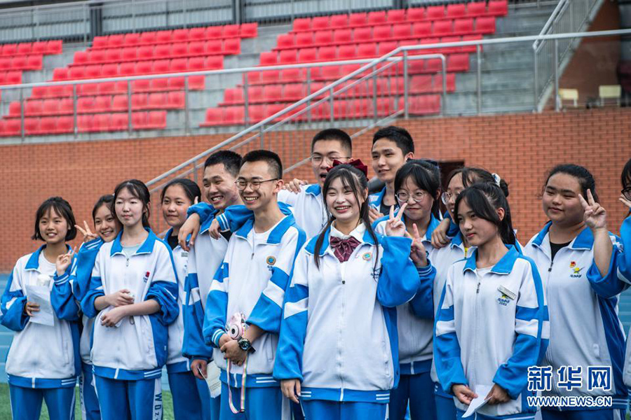 1/06月9日,烏當(dāng)中學(xué)高三學(xué)生在操場(chǎng)上拍照留念。(新華社記者 陶亮/攝)