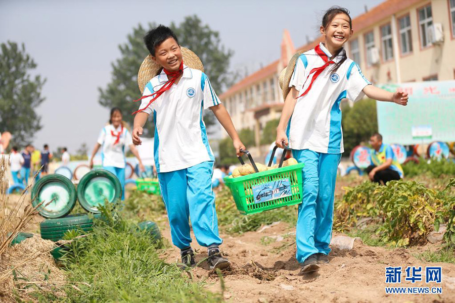 6月22日,青島藍谷高新區(qū)東皋埠小學學生在“責任田”里搬運收獲的馬鈴薯。(新華社發(fā) 梁孝鵬/攝)