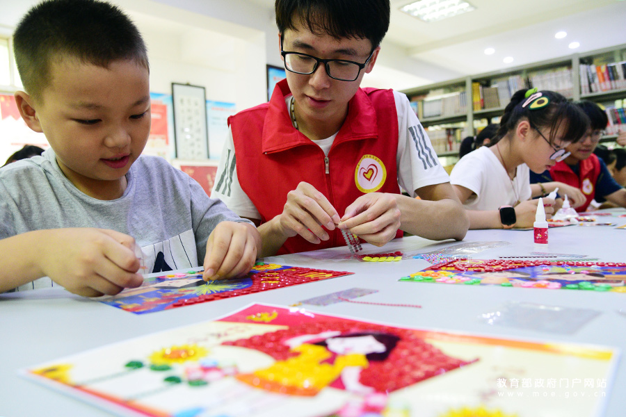 6月26日,在江蘇省鎮(zhèn)江市同德里社區(qū),江蘇大學志愿者在指導小朋友用五彩紐扣貼制黨史主題畫。(石玉成/攝)