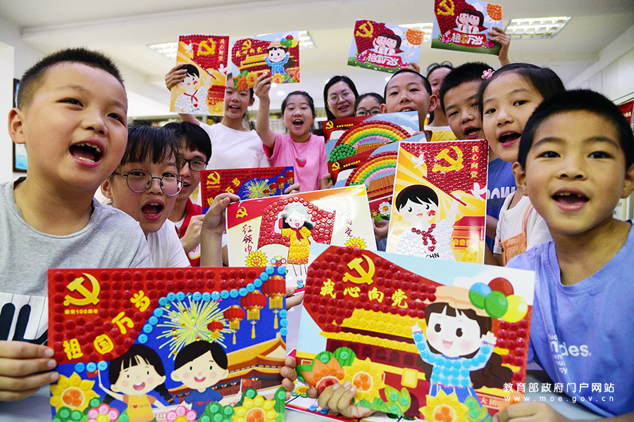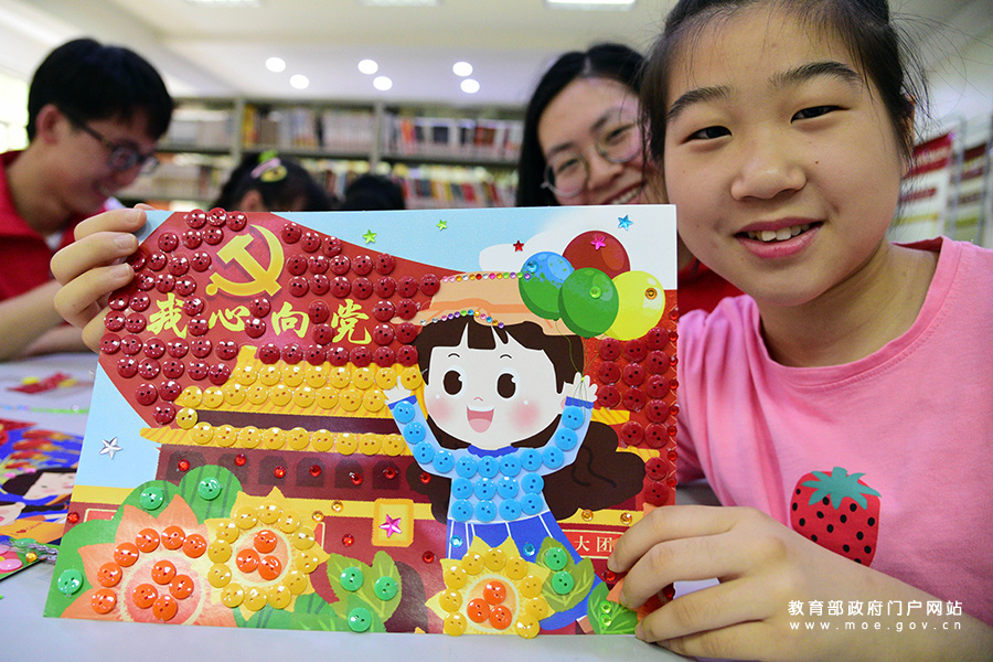 6月26日,江蘇大學志愿者指導小朋友用五彩紐扣貼制黨史主題畫。當日,江蘇大學志愿者來到鎮(zhèn)江市潤州區(qū)寶塔路街道同德里社區(qū),開展“童心向黨 禮贊百年”主題教育活動,指導小朋友用五彩紐扣貼制出一幅幅黨史主題畫,一起分享黨史故事,慶祝建黨100周年。(石玉成/攝)