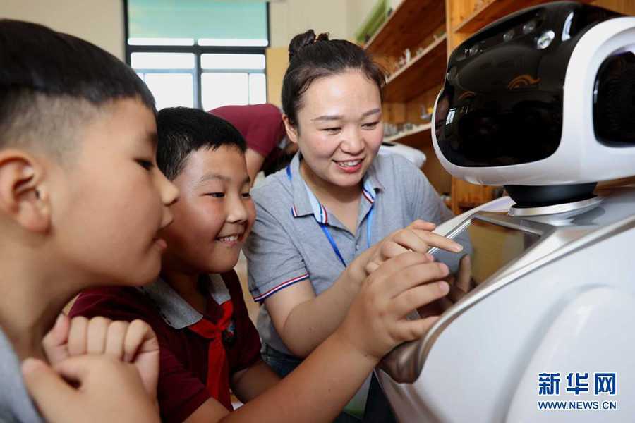 1/07月21日,在安徽省合肥市和平小學(xué)第二小學(xué)少年宮,孩子們在暑托班里和機(jī)器人做互動游戲。(新華社發(fā) 解琛/攝)