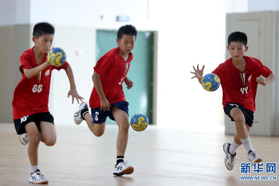 1/07月21日,在安徽省合肥市和平小學(xué)第二小學(xué)少年宮,孩子們在暑托班里進(jìn)行手球訓(xùn)練。(新華社發(fā) 解琛/攝)