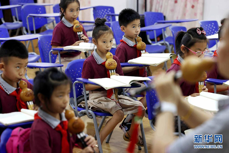 1/07月21日,在安徽省合肥市和平小學(xué)第二小學(xué)少年宮,孩子們在暑托班里練習(xí)葫蘆絲吹奏。(新華社發(fā) 解琛/攝)