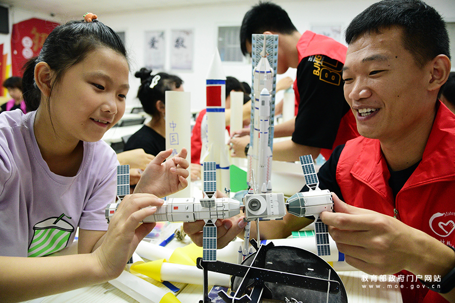 7月27日,在江蘇省鎮(zhèn)江市紅光社區(qū),江蘇大學(xué)志愿者在指導(dǎo)小朋友拼裝制作航天模型。(石玉成/攝)