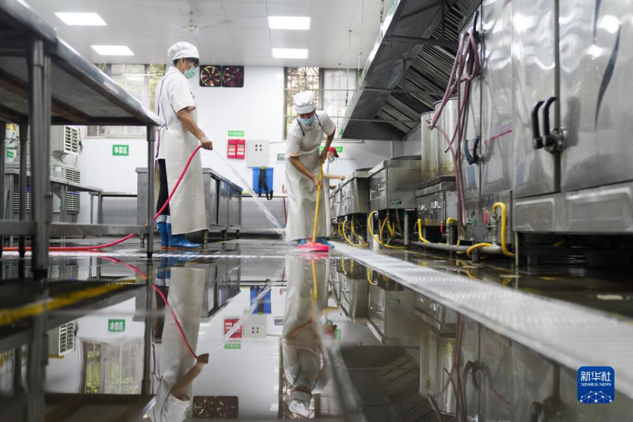 8月25日,在重慶市北碚區(qū)朝陽小學,工作人員在清洗廚房地面。(新華社發(fā) 秦廷富/攝)