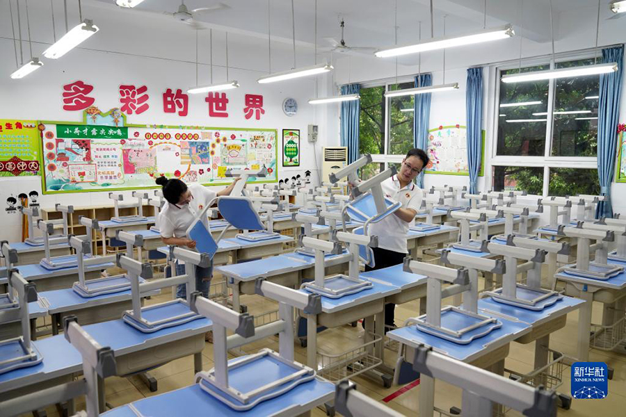 8月25日,在重慶市北碚區(qū)朝陽小學,教師在整理教室桌椅。(新華社發(fā) 秦廷富/攝)